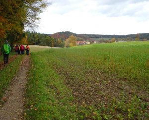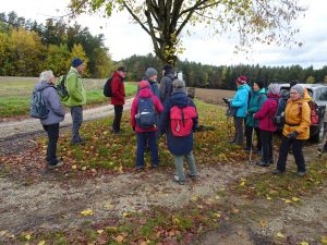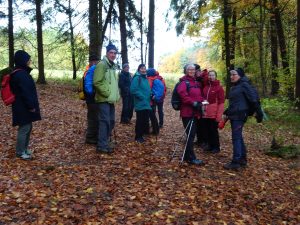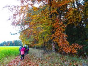 Trotz der schlechten Wetterprognose kamen 18 Wanderer  um Gerhard auf einer interessanten, landschaftlichen reizvollen Tour durch das Birgland zu begleiten. Beim Start in Holnstein ging es über nasse Wiesen zuerst Richtung Mittelreinbach und ein kalter Wind blies der Wandergruppe entgegen. Erst im Wald oberhalb Gaisheim wurde es etwas gemütlicher und der Weg durch die buntgefärbten Laubwälder war ein Genuss. Ab und zu spitzte die Sonne heraus und verstärkte das Farbenspiel der bunten Blätter. In Höhe von Gaisheim sah man im Hintergrund den Ossinger und den Zantberg. Nachdem der kleine Ort Buchhof  erreicht wurde, zeigte uns Gerhard das sognannte Buchhofer Windloch. Es war eine tiefe Felsspalte die ziemlich versteckt, durch Bäume und Sträucher geschützt am Wanderweg liegt. Dann ging es aber schnurstracks zur Mittagseinkehr nach Kirchenreinbach. Die Wandergruppe war sehr dankbar, dass sie bisher vom Regen verschont blieb. Aber ein Blick aus dem Fenster der Gaststätte – es regnet. Beim Start zum Rückweg nach Holnstein war der Regen vorbei und sogar der Wind hatte nachgelassen. Allerdings ging es erst mal kräftig den Rotberg hinauf und oben angelangt war eine Verschnaufpause erforderlich .Aber es waren nur noch ein paar Kilometer bis zum Parkplatz und wir konnten ganz entspannt auf, zwar nassen, Wanderwegen nach Holnstein gehen. Fazit des Tages- man sollte sich nicht von einer schlechten Wettervorhersage abhalten lassen- es wird meist nicht so schlimm. Dafür hatten wir eine herrliche bunt gefärbte Gegend durchwandert,eine gemütliche Einkehr genossen und einen schönen, unterhaltsamen Sonntag erlebt.