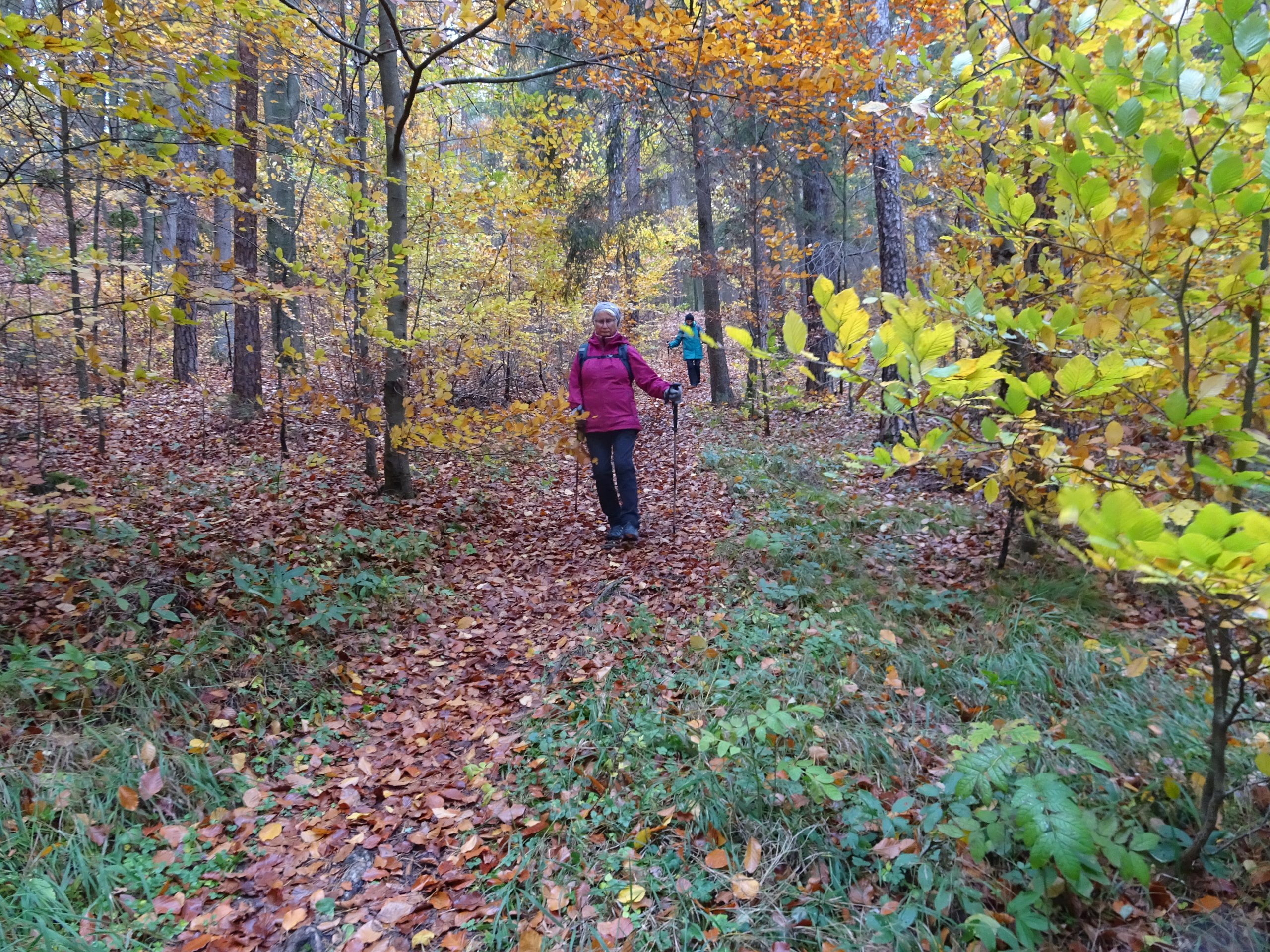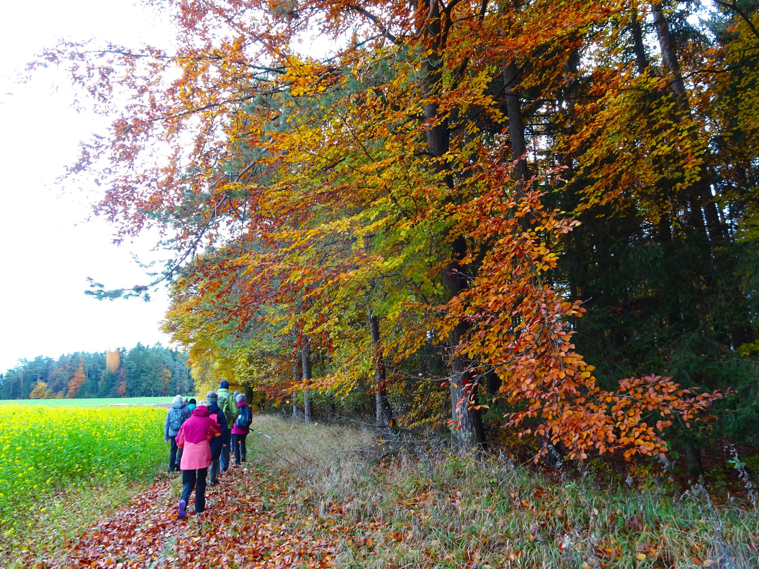 Trotz der schlechten Wetterprognose kamen 18 Wanderer  um Gerhard auf einer interessanten, landschaftlichen reizvollen Tour durch das Birgland zu begleiten. Beim Start in Holnstein ging es über nasse Wiesen zuerst Richtung Mittelreinbach und ein kalter Wind blies der Wandergruppe entgegen. Erst im Wald oberhalb Gaisheim wurde es etwas gemütlicher und der Weg durch die buntgefärbten Laubwälder war ein Genuss. Ab und zu spitzte die Sonne heraus und verstärkte das Farbenspiel der bunten Blätter. In Höhe von Gaisheim sah man im Hintergrund den Ossinger und den Zantberg. Nachdem der kleine Ort Buchhof  erreicht wurde, zeigte uns Gerhard das sognannte Buchhofer Windloch. Es war eine tiefe Felsspalte die ziemlich versteckt, durch Bäume und Sträucher geschützt am Wanderweg liegt. Dann ging es aber schnurstracks zur Mittagseinkehr nach Kirchenreinbach. Die Wandergruppe war sehr dankbar, dass sie bisher vom Regen verschont blieb. Aber ein Blick aus dem Fenster der Gaststätte – es regnet. Beim Start zum Rückweg nach Holnstein war der Regen vorbei und sogar der Wind hatte nachgelassen. Allerdings ging es erst mal kräftig den Rotberg hinauf und oben angelangt war eine Verschnaufpause erforderlich .Aber es waren nur noch ein paar Kilometer bis zum Parkplatz und wir konnten ganz entspannt auf, zwar nassen, Wanderwegen nach Holnstein gehen. Fazit des Tages- man sollte sich nicht von einer schlechten Wettervorhersage abhalten lassen- es wird meist nicht so schlimm. Dafür hatten wir eine herrliche bunt gefärbte Gegend durchwandert,eine gemütliche Einkehr genossen und einen schönen, unterhaltsamen Sonntag erlebt.