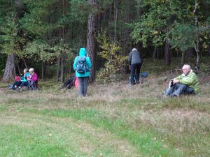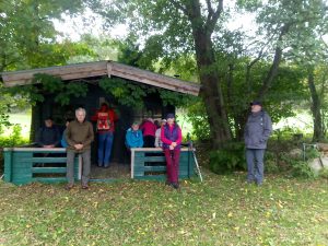 Die Kurzwanderer gingen dann auf dem Venezianersteig, vorbei an den Teichen mit den aufgeregten Stockenten, Richtung Eckendorfer Höhe. Nach kurzer Trinkpause am Hochsitz im Wald über Eckendorf ging es hinunter zur steinernen Sitzgruppe am Dorfplatz zur Mittagspause, wobei ein naher Apfelbaum willkommene Abwechslung zur eigenen Brotzeit brachte. Weiter ging es durch die liebliche Landschaft zu den Langwiedteichen. Eine idyllische Hütte am Weiher lud zur letzten Rast ein. Das Ziel, die Einkehr bei „Mutzi“ beflügelte die Gruppe, den inzwischen war es doch relativ kühl geworden.