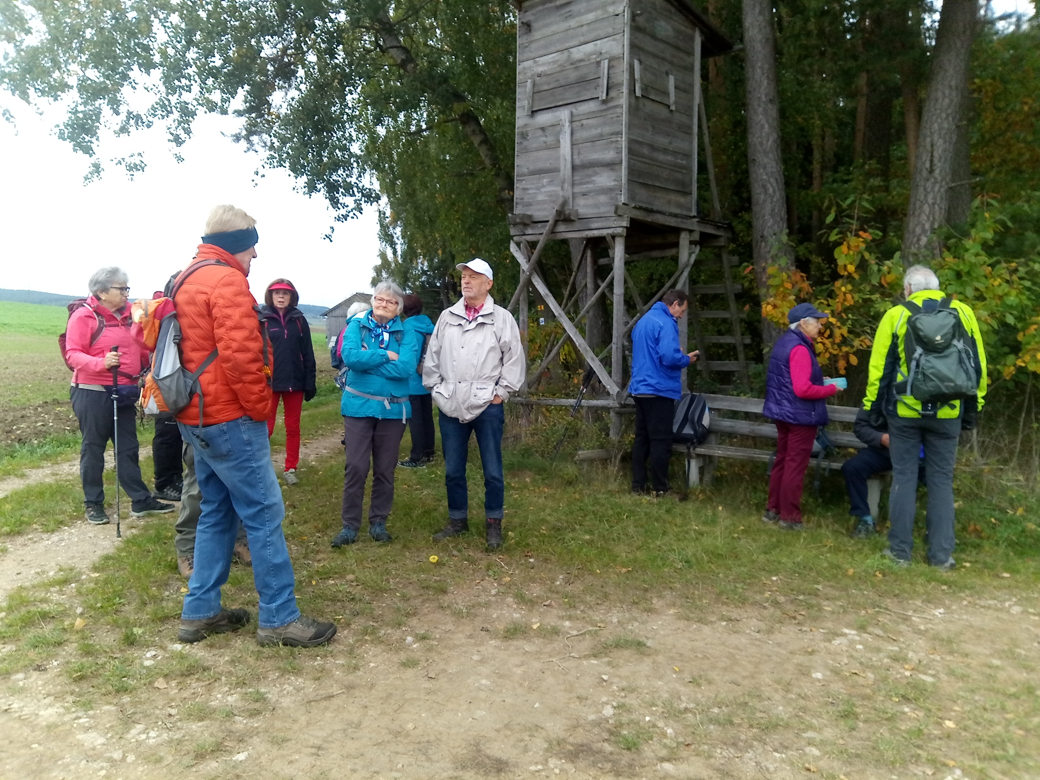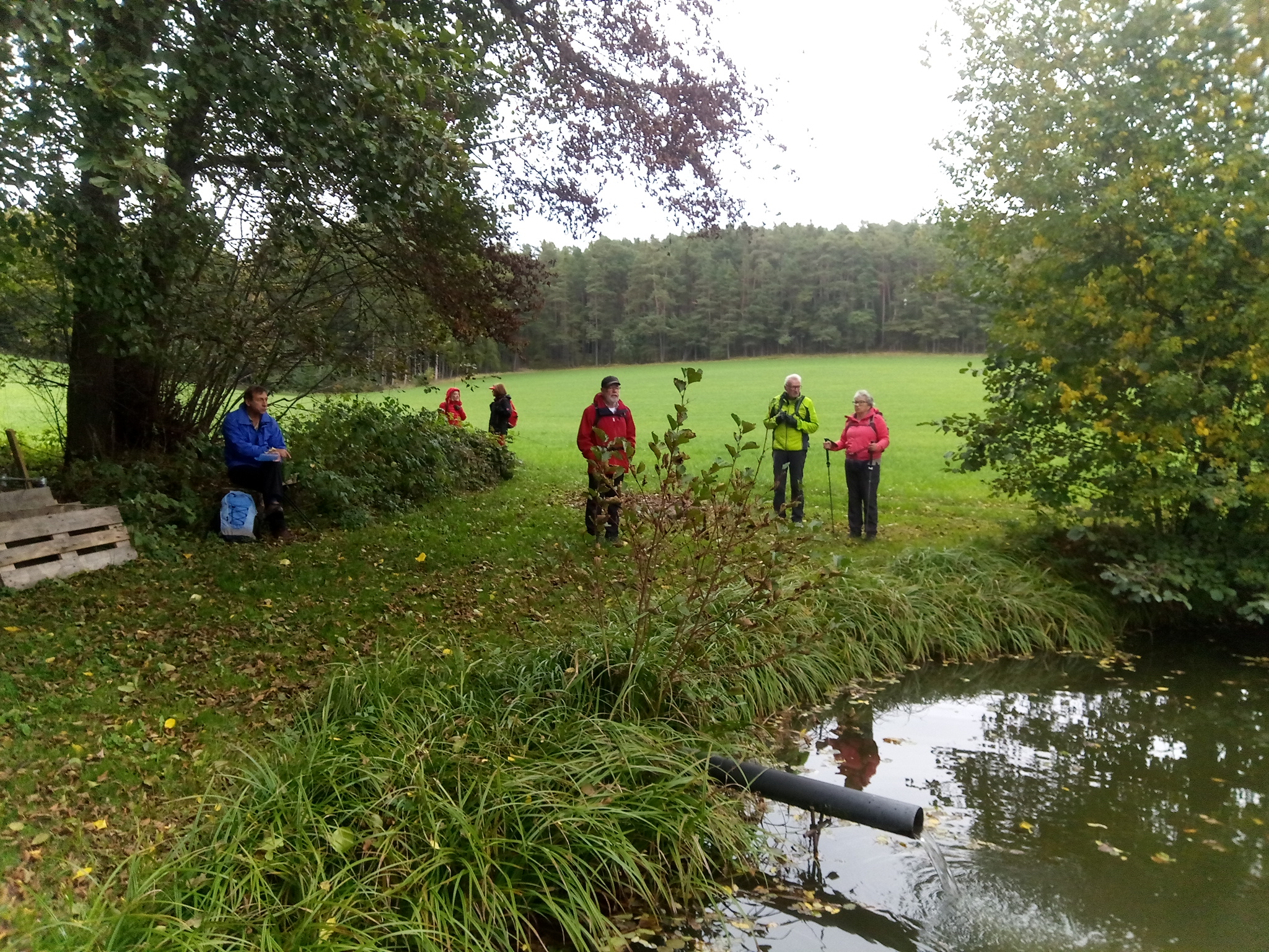 Die Kurzwanderer gingen dann auf dem Venezianersteig, vorbei an den Teichen mit den aufgeregten Stockenten, Richtung Eckendorfer Höhe. Nach kurzer Trinkpause am Hochsitz im Wald über Eckendorf ging es hinunter zur steinernen Sitzgruppe am Dorfplatz zur Mittagspause, wobei ein naher Apfelbaum willkommene Abwechslung zur eigenen Brotzeit brachte. Weiter ging es durch die liebliche Landschaft zu den Langwiedteichen. Eine idyllische Hütte am Weiher lud zur letzten Rast ein. Das Ziel, die Einkehr bei „Mutzi“ beflügelte die Gruppe, den inzwischen war es doch relativ kühl geworden.